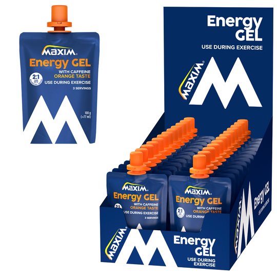 Maxim Energy Gel Orange bevat ook cafeïne, wat bijdraagt aan het uithoudingsvermogen.
